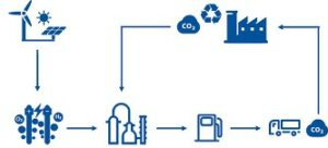 Síntesis: El hidrógeno y el CO2 capturado se combinan a través de procesos químicos para crear e-fuels, como gasolina o diésel sintético.